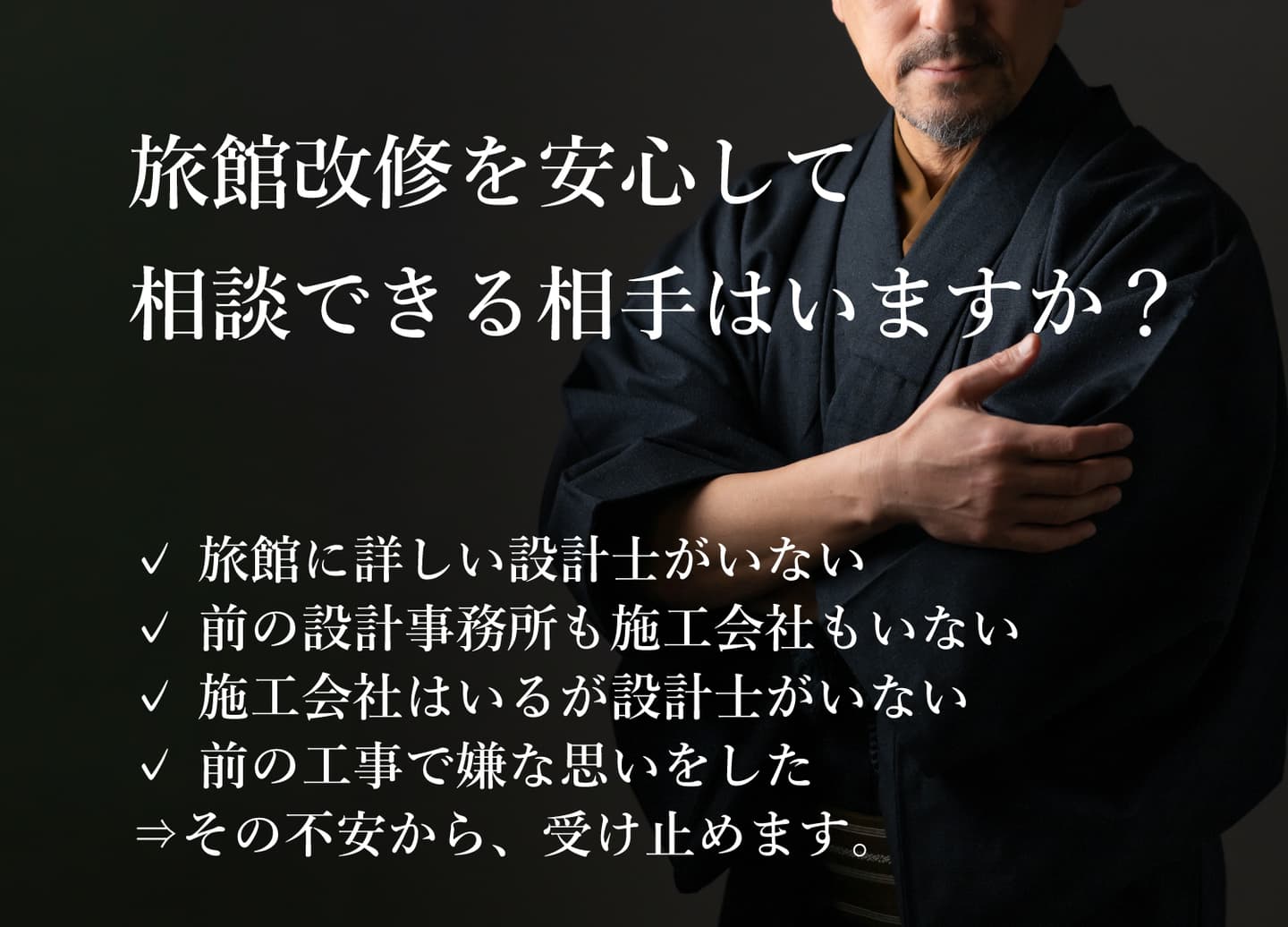 そんな旅館リノベーションに対するオーナー様の『お困り』『悩み』『不安』を“旅館リノベーション”の知識と経験が豊富な一級建築士が《解消・解決》致します!